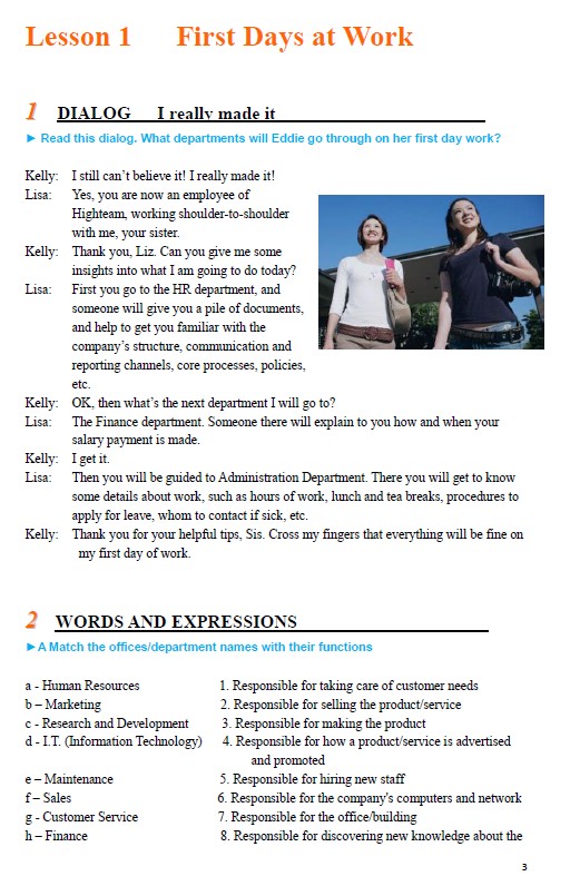 包含20个主题,谈论了有关工作着装、职位描述、福利待遇、预约会面、电话交谈、处理纠纷、商务旅行、演讲技巧、企业文化、团队合作、职员培训、应对压力和升职加薪等内容,涉及办公室常见的对话情景。