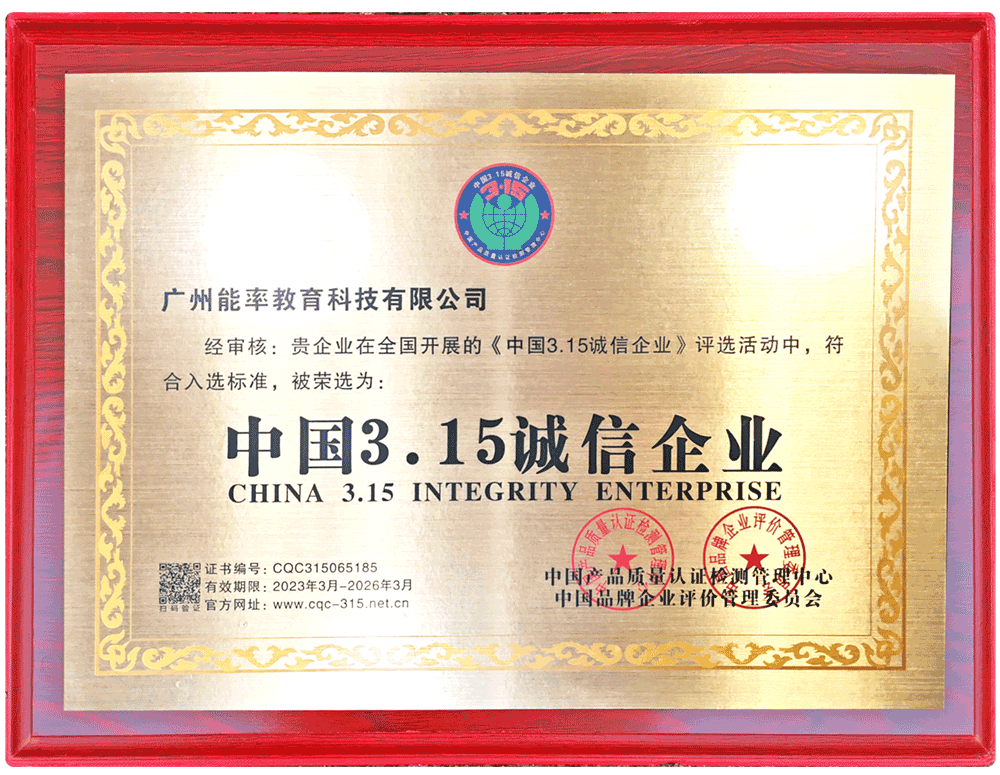 2023年3月,必克英语获评中国产品质量认证检测管理中心“中国3.15诚信企业”